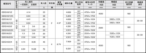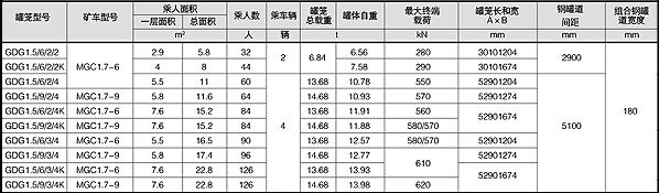 ***大載荷(t) 罐籠質量(t) 鋼繩終端質量(t) 首繩 直徑(mm) 尾繩 尺寸(mm) 罐籠 總高(mm) 鋼性罐道外形尺寸(mm) 鋼繩罐道(mm) 乘人數
